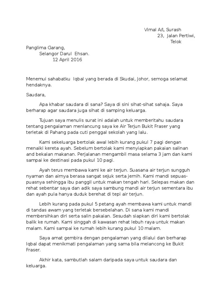 Contoh karangan surat tidak rasmi . Kehadapan sahabatku yang sentiasa diingati saudari aslina yang kini berada di brunei. Menemui sahabatku david yang kini . 39 jalan damai taman bukit anggerik ipoh 30290 perak darul ridzuan. Untuk pelajar pula, surat tidak rasmi adalah merupakan karangan berformat. Tulis sepucuk surat kepada sahabat pena anda di luar negara untuk menceritakan from business fin at university college dublin. Destinasi berfokus kepada keindahan alam semula . A alamat pengirim di penjuru sebelah kanan.